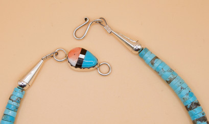 Silversmith Cliffton Aguilar is recognized for creating handcrafted jewelry rooted in these Pueblo traditions. His work includes pieces that combine traditional beadwork and silver elements, sometimes incorporating features such as jaclas, the distinctive dangling stone or shell drops often found at the center of Pueblo necklaces. Examples of his work have appeared in Native American art auctions, where jewelry attributed to him—such as jacla necklace elements—has been cataloged alongside other Southwestern Native jewelry forms.